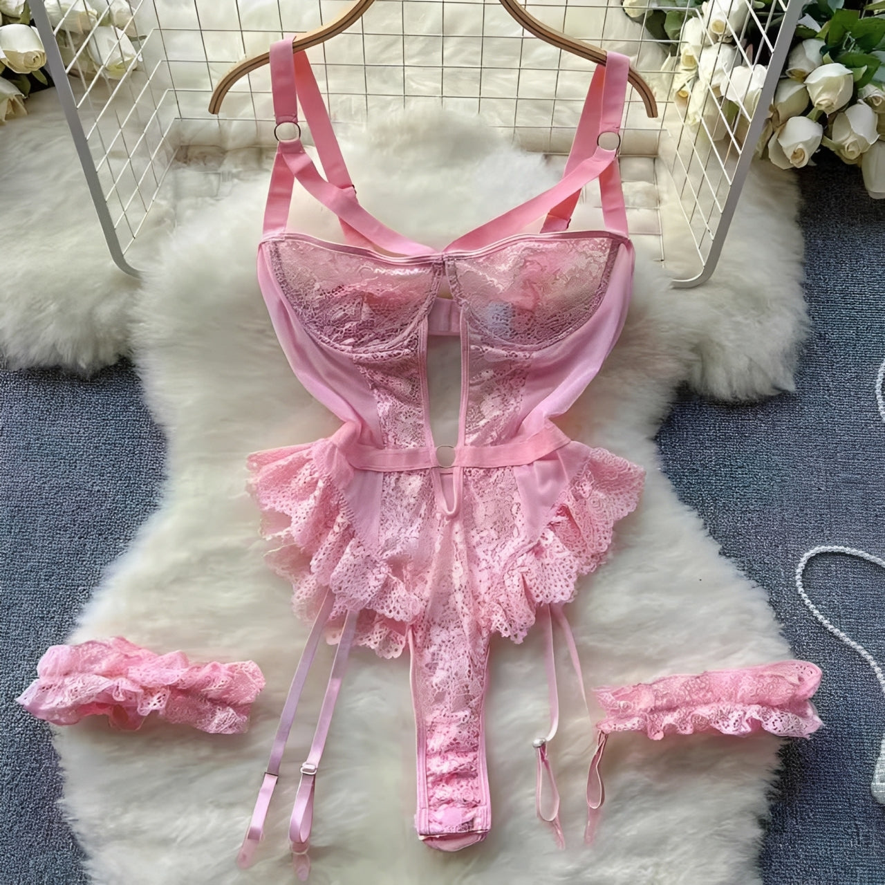 The Azure Desire Lace Teddy Set combines soft floral lace with a sculpting design that enhances your natural curves. Featuring adjustable shoulder straps, garter details and a flattering open-back silhouette, this piece is perfect for special nights — or whenever you want to feel powerful and irresistible.