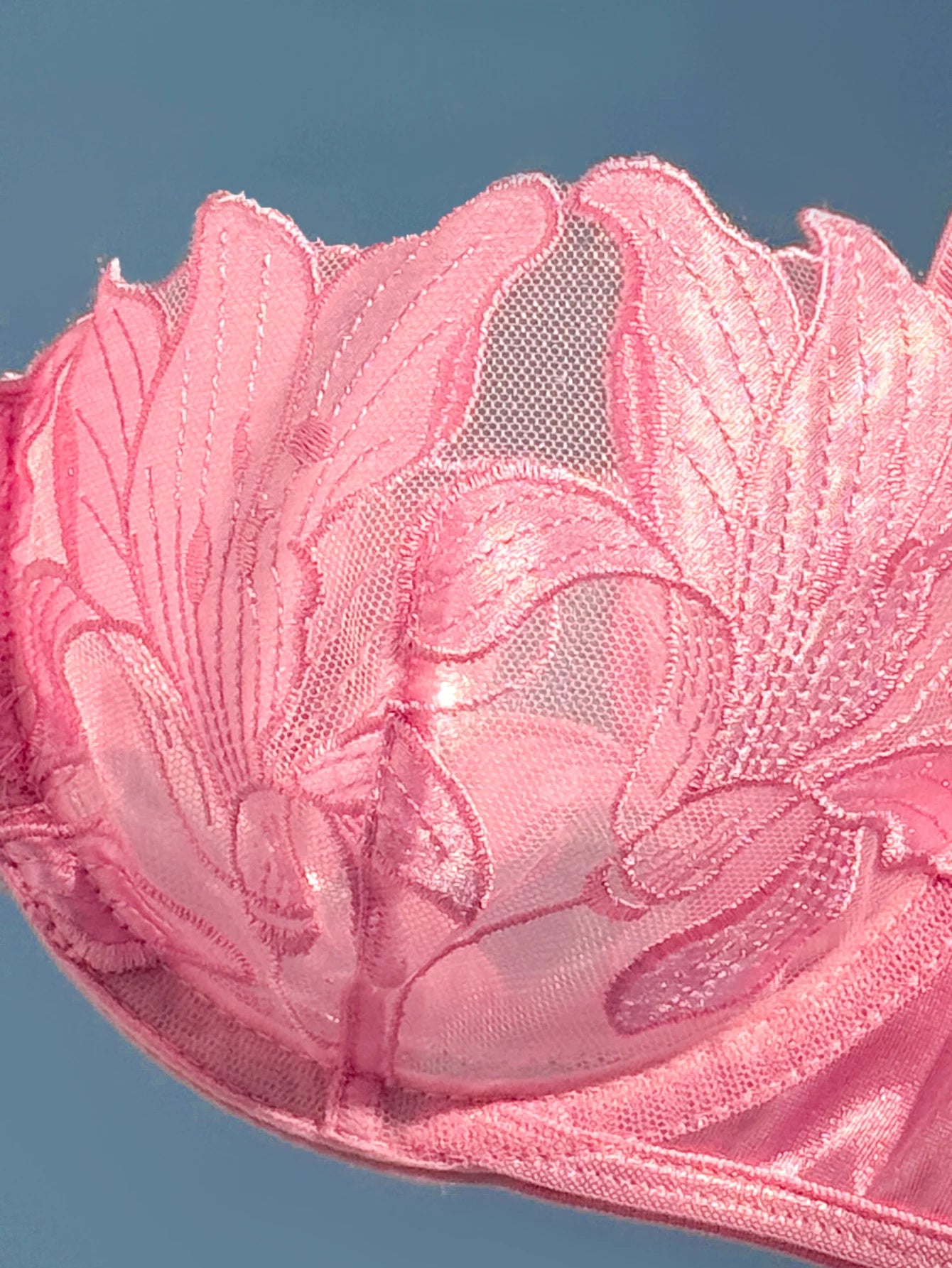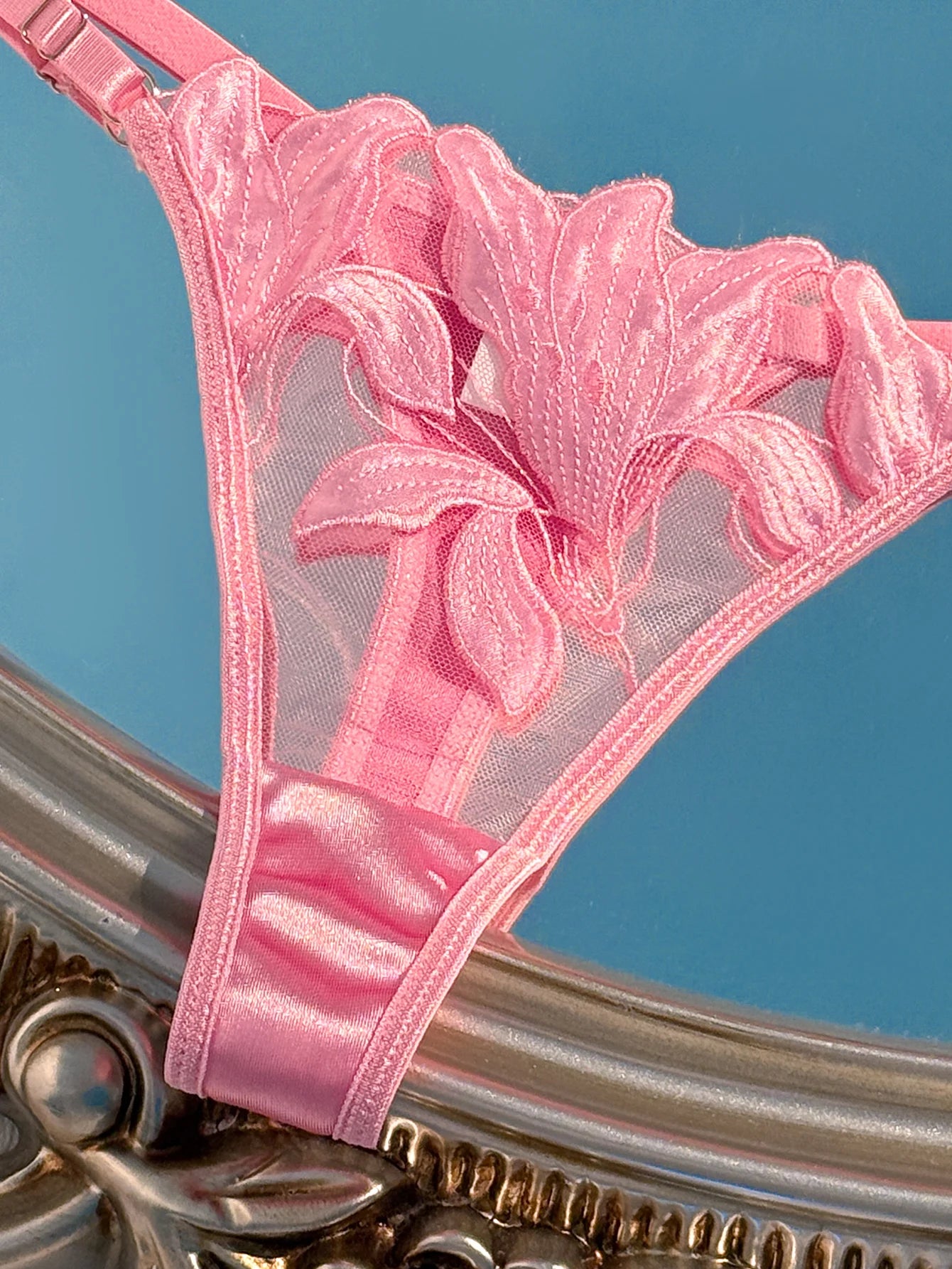 Crafted with floral embroidered lace and a silky pink finish, this set blends elegance with subtle sensuality. The underwired bra offers gentle support and shaping, while the matching thong enhances your natural curves with a lightweight, sheer feel.